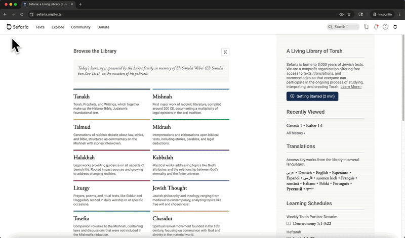 How to Change Your Password or Email Address Team Sefaria Updated January 22, 2026 20:22 You can change the email address or password linked to your Sefaria Account at any time. To change your password: Log out of your Sefaria Account. Click on the profile button, found in the top right corner of your screen, to open a dropdown menu. Click on Log in, the first option in the dropdown menu. Click on the words Forgot your password?, found underneath the login form. Type the email address linked to your Sefaria account into the provided text box. Click on the Send Reset Link button. A link to rest your password will be sent to the provided email address. Click on the link you receive. Type your desired password into the provided text box. Click on Save. Please note: In order to change the email address associated with your Sefaria Account, you must access the Account Settings page within the Sefaria Library interface. Therefore, when you click on Account Settings within the Voices on Sefaria interface, you will be redirected to your Sefaria Library Account Settings Page. Learn more >>> To change the email address associated with your Sefaria Account: Click on the profile button, found in the top right corner of your screen. Click on Account Settings. Scroll down to find the Account Email subheading. Click on the Change Email button. Type your desired email address into the provided text box. Click on the Update Email button.