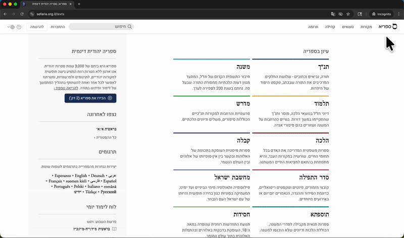 מדריך מהיר: הכירו את תוכן העניינים של ספריית ספריא Team Sefaria עודכן 27 בינ' 2026, 18:51 לכל מקור בספריית ספריא יש תוכן עניינים, אותו אפשר למצוא בשלוש דרכים: דרך סרגל הקישורים דרך ניווט לכותרת ספר מעמוד הבית של ספריא דרך שורת החיפוש למדו עוד על סרגל הקישורים והכלים של ספריית ספריא >>> על מנת למצוא את תוכן העניינים דרך סרגל הקישורים והכלים: לחצו על כל קטע במקור על מנת לפתוח את סרגל הקישורים. לחצו על תוכן העניינים. על מנת למצוא את תוכן העניינים דרך ניווט לכותרת ספר מעמוד הבית של ספריא: בחרו בכל קטגוריית טקסט (לדוגמא: אם אתם מחפשים את ספר שמות, לחצו על תנ"ך). בחרו בכותרת של הספר הרצוי. על מנת למצוא את תוכן העניינים דרך שורת החיפוש: הקלידו את כותרת הספר הרצוי בתוך שורת החיפוש שממוקמת בפינה השמאלית העליונה של המסך. בחרו בערך שלפניו סמל ספר כדי לפתוח את תוכן העניינים הרלוונטי. שימו לב: בעת ניווט במקורות ביישומון סםריית ספריא, ניתן לאתר את תוכן העניינים של כותר מסוים על ידי הקשה על כותרת של טקסט פתוח בראש המסך. למדו עוד על יישומון ספריא לנייד >>> מאפיינים נוספים בתוכן העניינים: בניווט בחמישה חומשי תורה, ניתן להשתמש בתוכן העניינים לפי פרשת השבוע. לשם כך, עקבו אחרי ההוראות לעיל לפתיחת תוכן העניינים ולאחר מכן: גללו למטה כדי למצוא את כותרת המשנה ״פרשיות התורה״. בחרו בשם הפרשה הרצויה כדי להגיע לתחילת הפרשה. על מנת לראות עלייה מסוימת (קטע מתוך פרשת השבוע), בחרו באות הרצויה מתחת לשם הפרשה. בניווט בתלמוד, ניתן להשתמש בתוכן העניינים כדי לבחור בין התלמוד הבבלי לתלמוד הירושלמי. בניווט בתוספתא, ניתן להשתמש בתוכן העניינים כדי לבחור בין מהדורות וילנה וליברמן.בניווט בספר הזהר, ניתן להשתמש בתוכן העניינים כדי לבחור בין מהדורות וילנה (חלוקה לפי דף) וסגנון הסולם (חלוקה לפי מאמר).