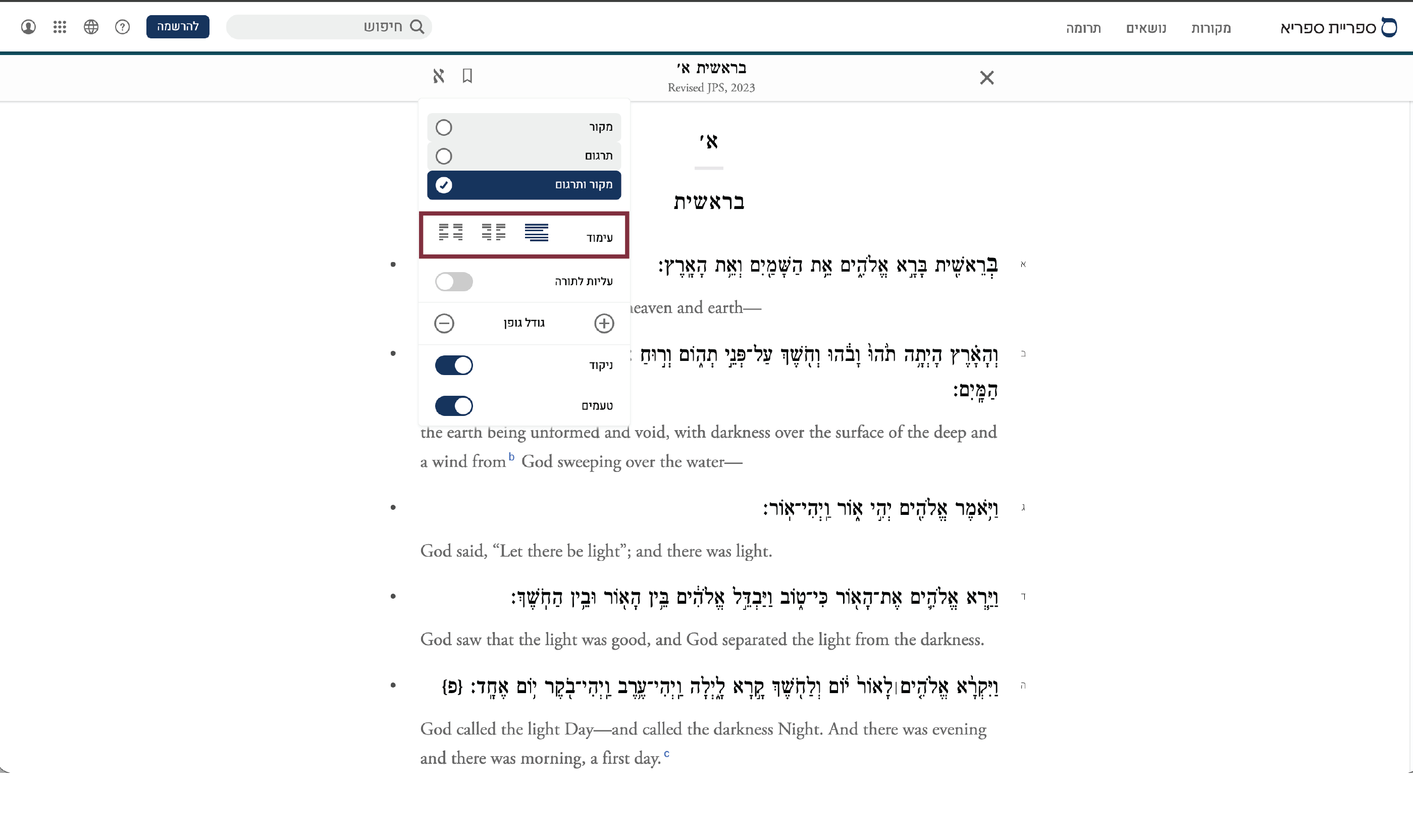אפשרויות פריסת טקסט דו-לשוני Team Sefaria עודכן 28 בינ' 2026, 17:11 בספריא ניתן לבחור מבין שלוש אפשרויות לתצוגת שפה: מקור תרגום מקור ותרגום >>> למדו כיצד לבחור את תצוגת השפה המועדפת בעקבות בחירה באפשרות השלישית: עיון בטקסט בשפת המקור לצד תרגום, תוכלו לבחור בין שלוש אפשרויות תצוגה: שפת מקור מימין שפת מקור משמאל שפת מקור מעל לתרגום לבחירת אפשרות התצוגה הדו-לשונית המועדפת: בחרו בתפריט A או א אשר בפינה השמאלית העליונה של המסך. בחרו במקור ותרגום כדי לוודא שאתם צופים בטקסט במצב דו-לשוני. ליד כותרת המשנה "עימוד", בחרו באחד משלושת הסמלים כדי לציין את העדפת הפריסה שלכם.