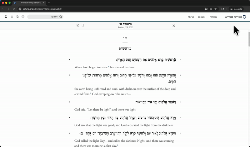 מציאת הגדרות של מילים בעברית או ארמית Team Sefaria עודכן 4 בפב' 2026, 18:25 בממשק של ספריא מוטמעים מספר כלים לתמיכה והעשרה של חווית הלימוד, כולם מקושרים לטקסטים שבספרייה לגישה נוחה ועיון קל.>>> למדו עוד על כלי עזר בספריא ישנן שתי אפשרויות לחיפוש הגדרה של מילה בעברית או בארמית בספריית ספריא: על ידי לחיצה כפולה על המילה הרצויה על ידי פתיחת מילון בסרגל הקישורים והכלים כדי לחפש הגדרה של מילה בעברית או בארמית באמצעות לחיצה כפולה: בחרו בכל מקטע טקסט כדי לפתוח את סרגל הקישורים והכלים. לחצו לחיצה כפולה על המילה שברצונכם לפרש כדי לצפות במספר הגדרות. גללו בהגדרות הזמינות כדי לאתר את ההגדרה המתאימה ביותר לצרכיכם. כדי לחפש הגדרה של מילה בעברית או בארמית באמצעות על ידי פתיחת מילון: בחרו בכל מקטע טקסט כדי לפתוח את סרגל הקישורים והכלים גללו למטה ואתרו את כותרת המשנה "מילונים", שבתת-הנושא "כלים". לחצו על מילונים כדי לפתוח לוח עם שורת חיפוש. בשורת החיפוש, הקלידו את המילה שברצונכם לפרש ולחצו על return (ב-Mac) או enter (ב-PC). גללו בהגדרות הזמינות כדי לאתר את ההגדרה המתאימה ביותר לצרכיכם. שימו לב: שם המילון שממנו מגיע כל ערך נמצא מתחת לכל קבוצת הגדרות.