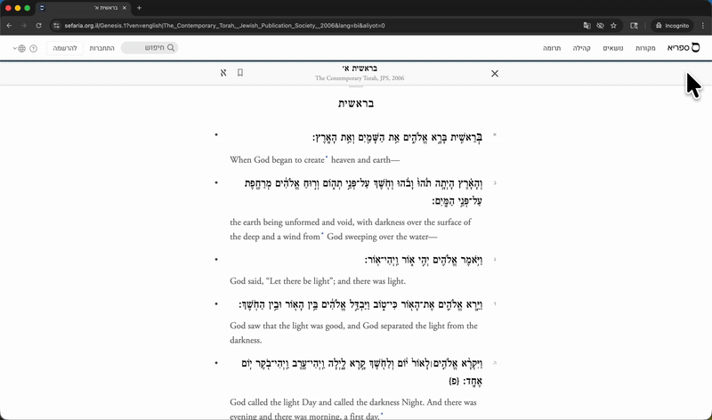 אפשרויות תרגום: בחירת תרגום מועדף בספריית ספריא Team Sefaria עודכן 28 בינ' 2026, 15:25 מקורות רבים בספריית ספריא זמינים במבחר תרגומים ומהדורות. ניתן להחליף בין מהדורות ותרגומים, ואף לצפות בשני תרגומים שונים בו זמנית (למשל עברית וצרפתית) בחלוניות סמוכות. על מנת לשנות תרגומים בעת עיון בספרייה בדפדפן: בחרו בכל מקטע טקסט כדי לפתוח את סרגל הקישורים והכלים. אתרו את המילה "תרגומים" בסרגל הקישורים והכלים. בחרו ״תרגומים״ כדי לצפות באפשרויות הזמינות. גללו ברשימת האפשרויות כדי למצוא תרגום מועדף. הקישו על "בחירה", מתחת לכותרת התרגום, כדי לאשר את בחירתכם. כדי לפתוח תרגום נוסף בחלונית סמוכה: בחרו על כל מקטע טקסט כדי לפתוח את סרגל הקישורים והכלים. אתרו את המילה "תרגומים" בסרגל הקישורים והכלים. הקישו על "תרגומים" כדי לצפות באפשרויות הזמינות. גללו ברשימת האפשרויות כדי למצוא תרגום מועדף. הקישו על טקסט התצוגה המקדימה כדי לפתוח חלונית חדשה המציגה את טקסט התצוגה המקדימה מעל שני כפתורים: "פתיחה" ו"הוספה לדף מקורות". לחצו על "פתיחה" כדי לראות את התרגום שבחרת בחלונית סמוכה. שימו לב: בחירת תרגום מקראי לחומש אחד תחול על כל חמישה חומשי תורה. בחירת תרגום ביישומון של ספריא דורשת תהליך נפרד. למדו עוד על אפשרויות תרגום ביישומון של ספריית ספריא >>>
