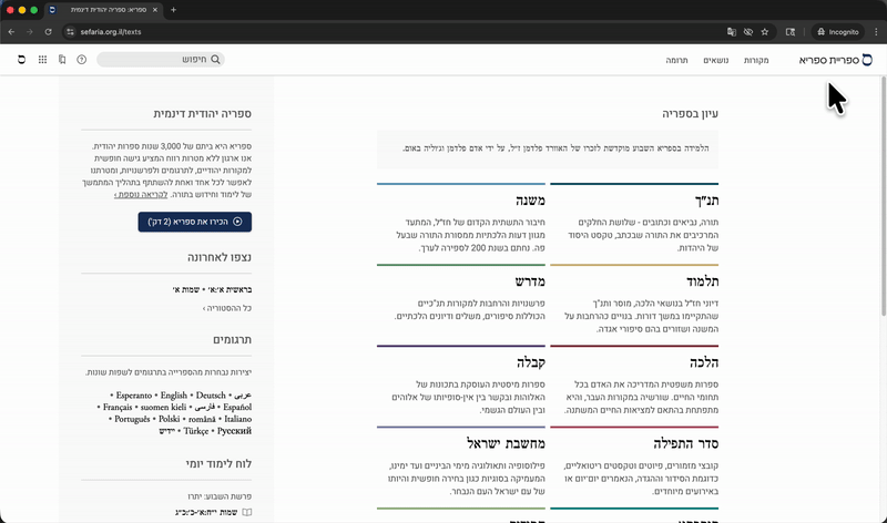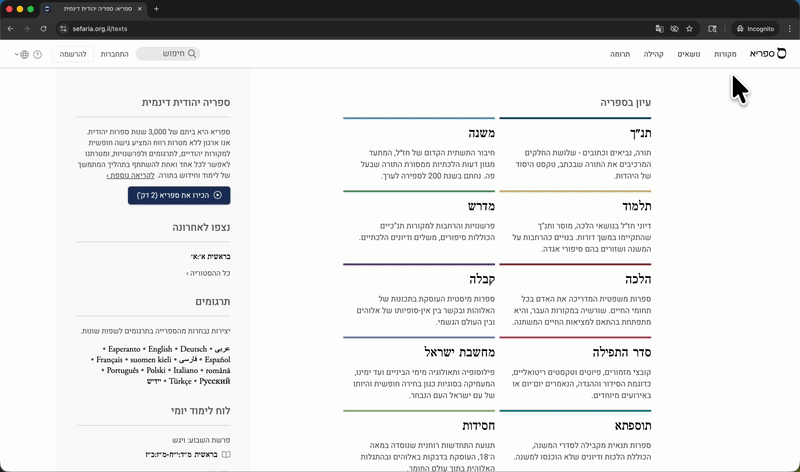 מעבר בין ממשקים בעברית ובאנגלית Team Sefaria עודכן 4 בפב' 2026, 18:27 לספריא יש ממשק בשפה האנגלית וממשק בשפה העברית. ישנן שלוש דרכים לעבור בין הממשקים: דרך הגדרות החשבון (לבעלי חשבון ספריא) באמצעות התפריט בפרופיל (לבעלי חשבון ספריא) מבלי להיות מחוברים לחשבון ספריא. למדו כיצד ליצור חשבון אישי בספריא >>> למעבר בין הממשקים באמצעות תפריט ״הגדרות״ (לבעלי חשבון ספריא): הקישו על כפתור הפרופיל, אשר בפינה השמאלית העליונה של המסך. הקישו על "הגדרות" שבתפריט הנפתח. אתרו את כותרת המשנה "שפת הממשק". הקישו על English או עברית. הקישו על כפתור "שמירה", שנמצא לצד הכותרת "הגדרות החשבון" או בתחתית העמוד. למעבר בין הממשקים באמצעות כפתור הפרופיל (לבעלי חשבון ספריא): הקישו על כפתור הפרופיל, אשר בפינה השמאלית העליונה של המסך. הקישו על עברית • English, האפשרות הרביעית בתפריט שנפתח. למעבר בין הממשקים מבלי להתחבר לחשבון ספריא: הקישו על סמל הגלובוס אשר בפינה הימנית העליונה של המסך בממשק האנגלי ובפינה השמאלית העליונה של המסך בממשק העברי. הקישו על עברית או English כדי לבחור את הממשק המועדף.