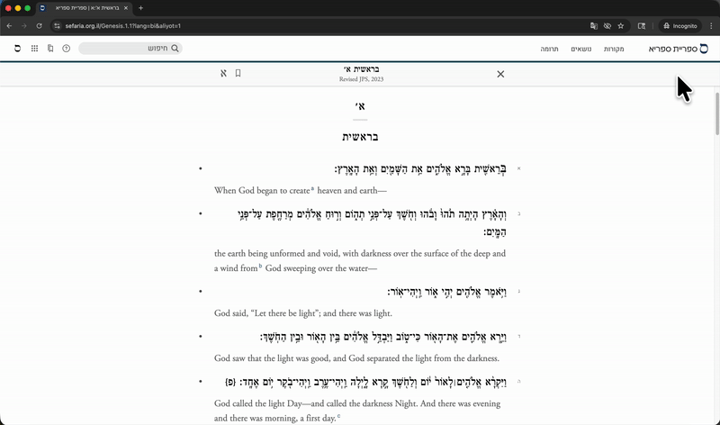 האזנה לקריאת פסוק מהתנ״ך Team Sefaria עודכן 4 בפב' 2026, 18:30 הודות לשיתוף פעולה עם PocketTorah, ניתן להאזין לקריאה בכל פסוקי חמישה חומשי תורה לפי מסורת אשכנז. להאזנה לפסוק:בחרו בכל מקטע טקסט כדי לפתוח את סרגל הקישורים והכלים.גללו למטה ומצאו את תת-הכותרת "קריאה בתורה".בחרו בתת-הכותרת "קריאה בתורה".בחרו בכפתור ההפעלה (▶) כדי לשמוע את ההקלטה.