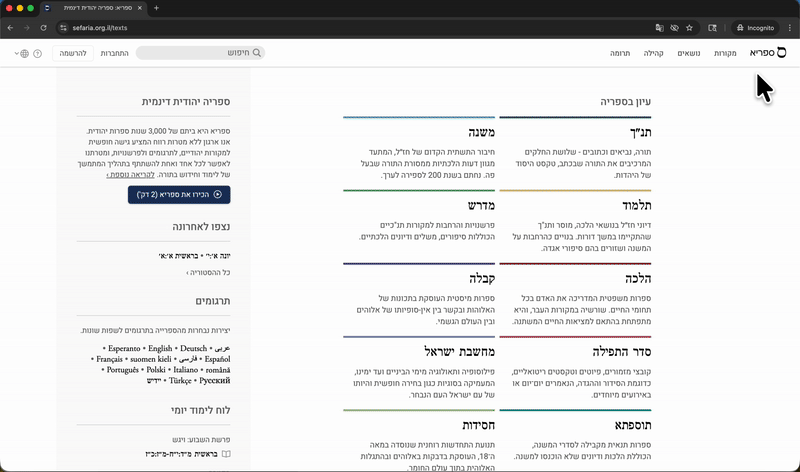 מיון תוצאות חיפוש Team Sefaria עודכן 27 בינ' 2026, 19:04 ניתן למיין מקורות לפי רלוונטיות או לפי סדר כרונולוגי וכן לפי קטגוריית טקסט. ניתן גם לבחור להציג רק מקורות שתואמים בדיוק את שאילתת החיפוש שלכם.שימו לב: בדפי נושא, שבהם המקורות נאספו ואורגנו עם כותרות משנה, ניתן למיין רק אם בחרתם בלשונית "כל המקורות", הנמצאת מתחת לכותרת הדף. לסינון מקורות על פי קטגוריית טקסט: הזינו את השאילתא בשורת החיפוש בדף הבית. הקישו על תיבת הסימון לפני קטגוריות הטקסט שברצונכם לכלול בתוצאות החיפוש (למשל תנ"ך או מחשבת ישראל), הנמצאות בצד השמאלי של המסך. כדי לראות תוצאות מתוך ספר מסוים (למשל שמות), הקישו על החץ שמימין לקטגוריית הטקסט כדי לפתוח תפריט נוסף. הקישו על התיבות המסומנות לפני כל ספר שברצונכם לכלול בתוצאות החיפוש. לחיפוש על פי קטגוריה:הזינו את השאילתא לתוך שורת החיפוש שבראש דף הבית. בצד שמאל של המסך, תראו רשימה של קטגוריות טקסט בהן מופיעה שאילתת החיפוש שלכם (לדוגמא: תנ"ך או מחשבת ישראל).בחרו בתיבות הסימון שמימין לקטגוריות הטקסט אותן תרצו לכלול בתוצאות החיפוש. להצגת תוצאות חיפוש התואמות בדיוק את השאילתא:הזינו את השאילתא בשורת החיפוש שבראש דף הבית.גללו לתחתית הסרגל שבצד שמאל של המסך.בחרו בתיבת הסימון שלפני המילים "התאמה מדויקת למילות החיפוש". למיון מקורות לפי רלוונטיות או סדר כרונולוגי:הזינו את השאילתא בשורת החיפוש בראש דף הבית ולחצו על enter (במחשב Mac) או return (במחשב PC).בחרו בכפתור המיון בפינה השמאלית העליונה של תוצאות החיפוש כדי לפתוח תפריט נוסף.לחצו על התוצאה הרצויה כדי לבחור אותה מבין האפשרויות המוצעות.