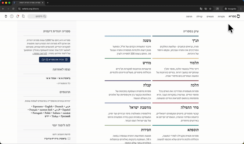 שינוי שפת הממשק Team Sefaria עודכן 3 במרץ 2026, 20:55 הממשקים של ספריית ספריא ושל חיבורים בספריא זמינים הן בעברית והן באנגלית. ניתן לעבור בין שני הממשקים בכל עת, גם מבלי להתחבר או להירשם לחשבון בספריא. לשינוי שפת הממשק, בין אם הנכם מחוברים לחשבון ספריא או לא:הקישו על כפתור הפרופיל, אשר בפינה השמאלית העליונה של המסך.לחצו על עברית או על English על מנת לבחור את האפשרות המועדפת עליכם.בנוסף, אם אינכם מחוברים לחשבונכם, ניתן לשנות את שפת הממשק באופן הבא:לחצו על סמל הגלובוס (🌐), אשר בפינה השמאלית העליונה של המסך.בחרו בשפה הרצויה, מבין האפשרויות בתפריט הנפתח.